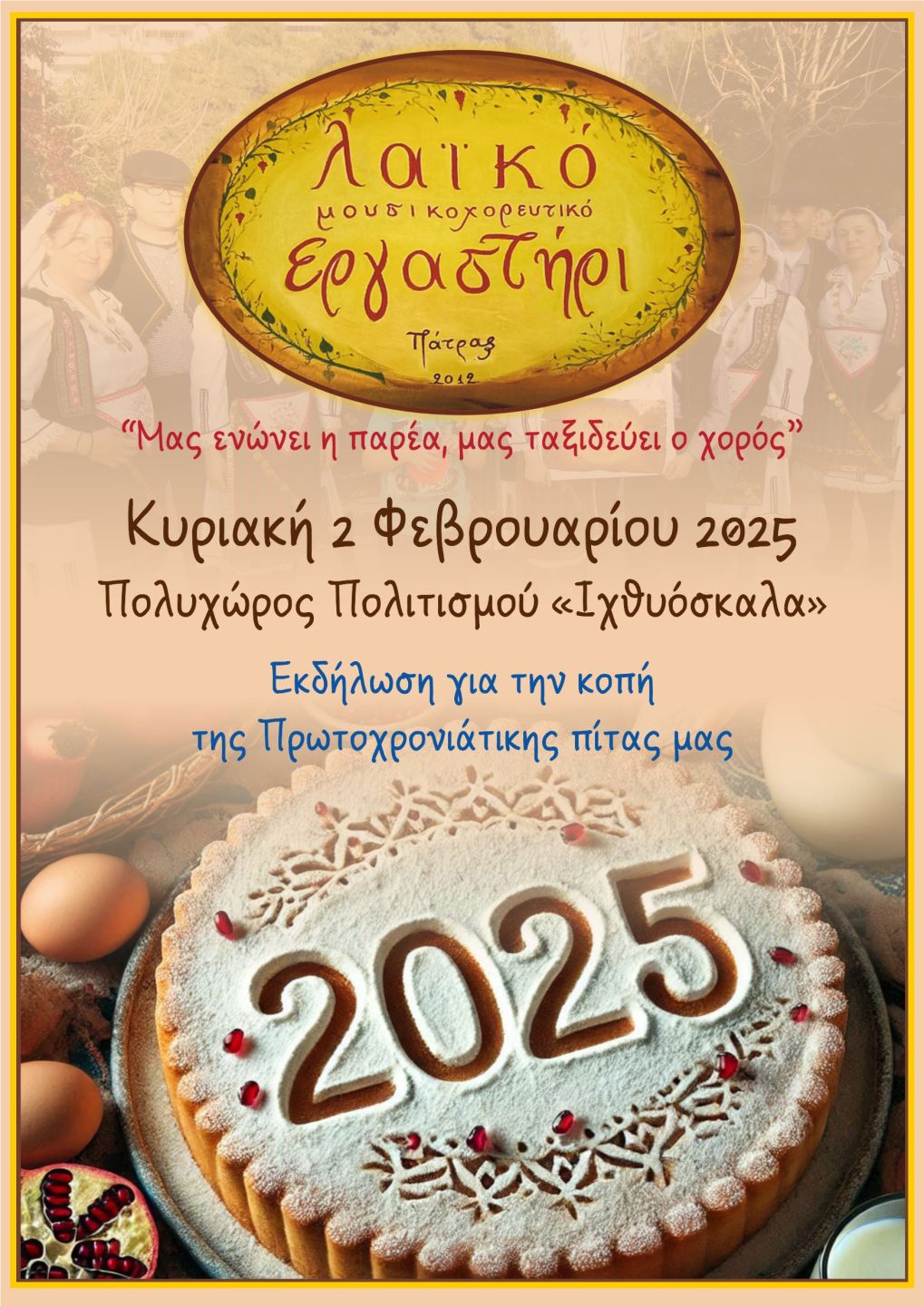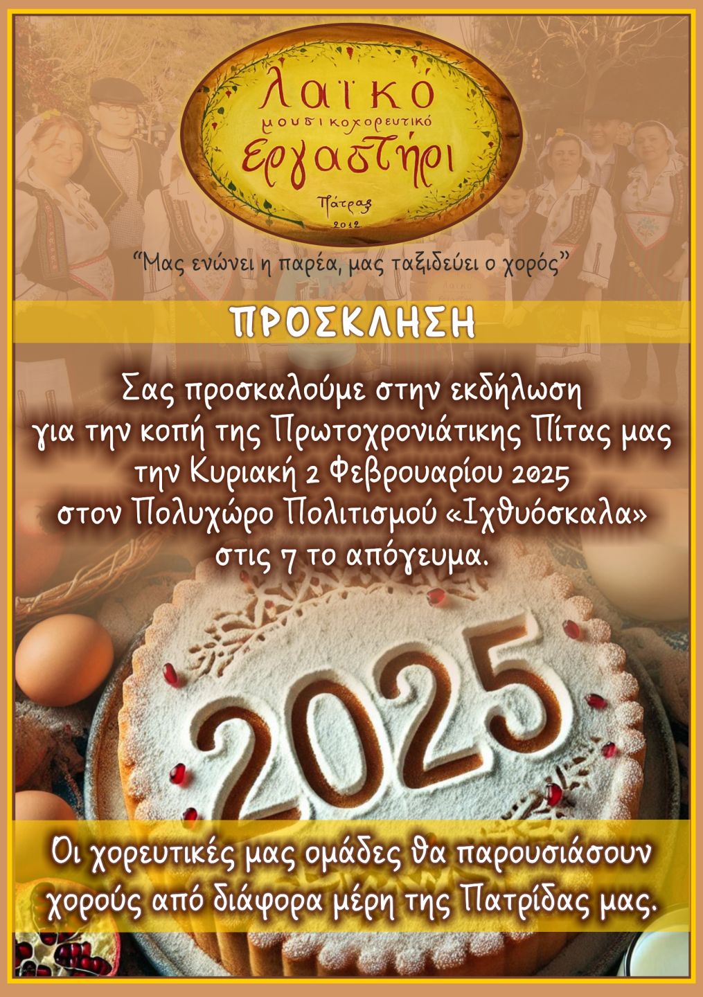 Την Κυριακή 2 Φεβρουαρίου 2025 έγινε, με πολύ μεγάλη επιτυχία, η εκδήλωση για την κοπή της Πρωτοχρονιάτικης Πίτας μας.