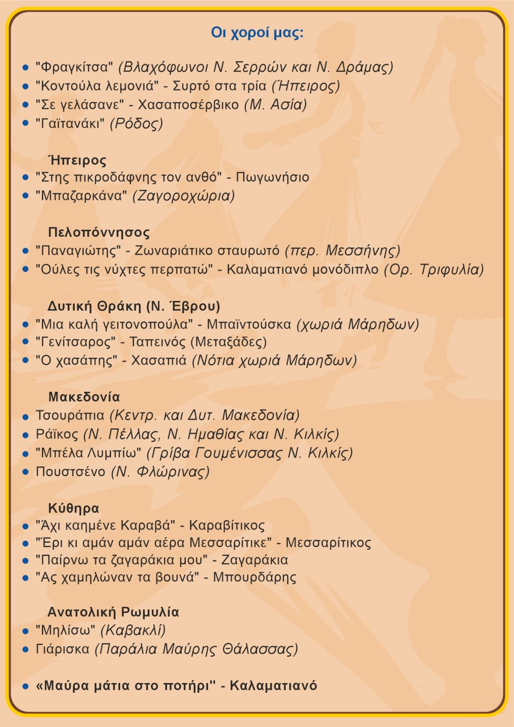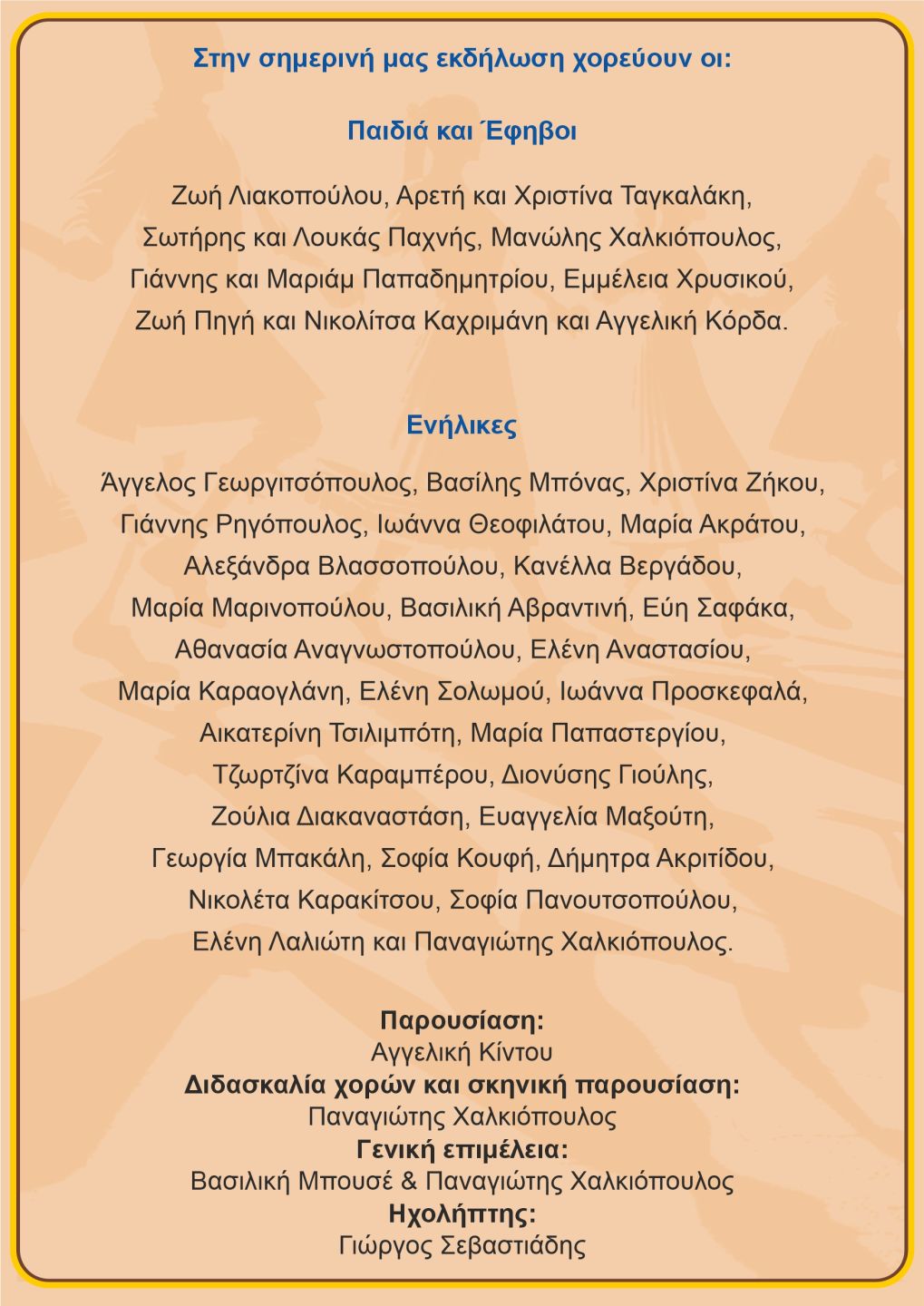 Το πλούσιο χορευτικό πρόγραμμα της εκδήλωσης, τα ονόματα των χορευτών, όλων των ηλικιών των ομάδων μας που χόρεψαν στην εκδήλωση καθώς και όλων των συντελεστών, υπάρχουν στο πρόγραμμα εκδήλωσης που θα δείτε στην αρχή του φωτογραφικού άλμπουμ που ακολουθεί.